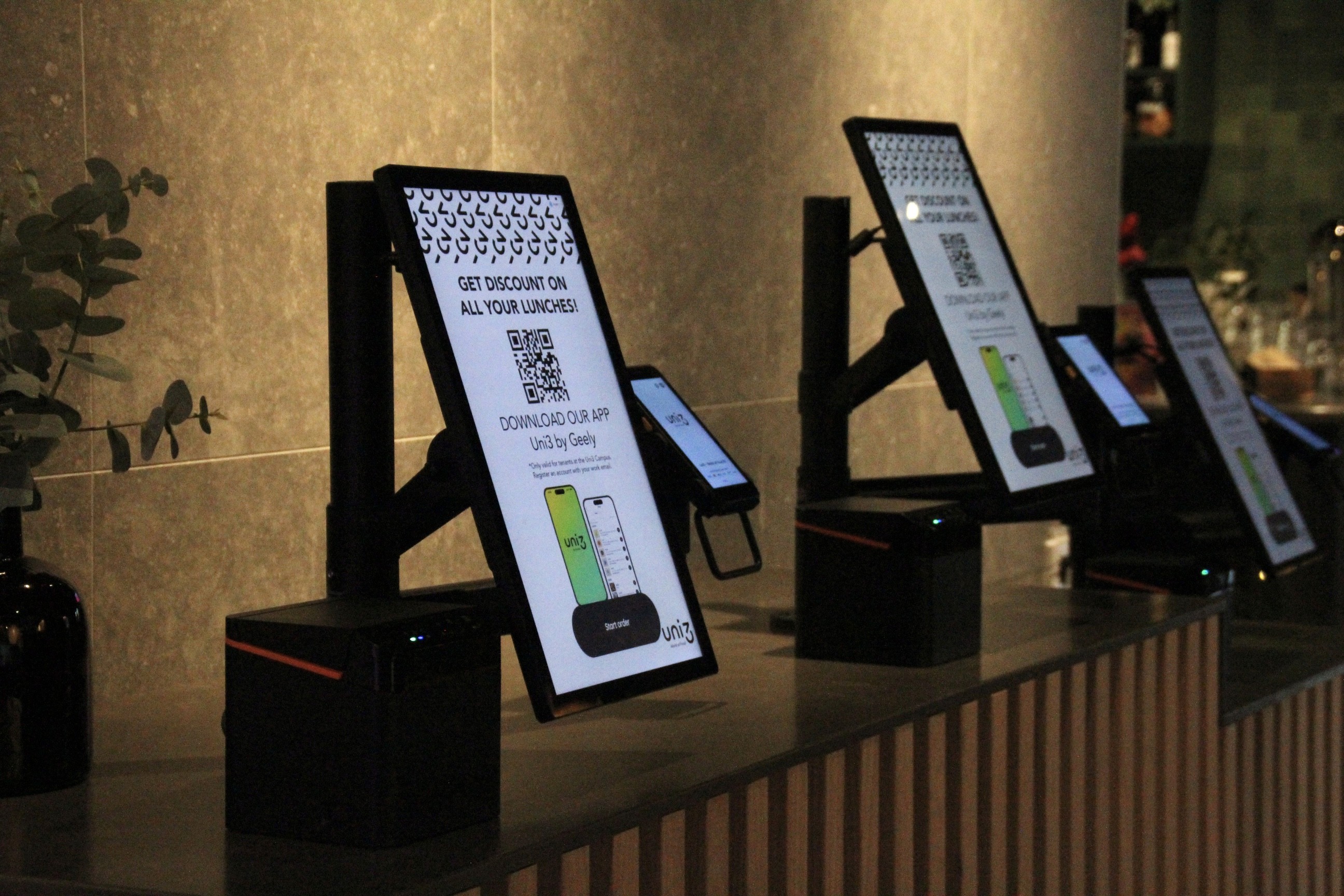 Med fem expresskassor utplacerade på centrala delar av restaurangen så har man också en möjlighet att nyttja skärmens viloläge till att nå ut med information eller reklam. På World of Food pushar man hårt för att få in sina gäster i deras app.